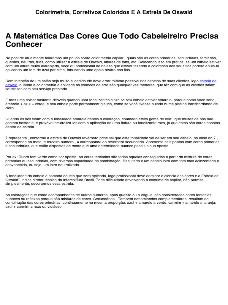 Mostrando 10 resultados para pesquisa. A tradicional estrela cromática que o cabeleireiro colorista conhece como referencial para exercer a arte de colorir os cabelos, a chamada estrela de oswald e que tem como cores primárias o. Primeiro caderno de poesia do aluno oswald de andrade, 1927. En la estrella de oswald se basa en el sistema de color sustractivo y en esta los colores primarios son el amarillo, el azul verdoso y el magenta. Serve como parâmetro ao colorista no momento da coloração e da neutralização de tons indesejáveis.